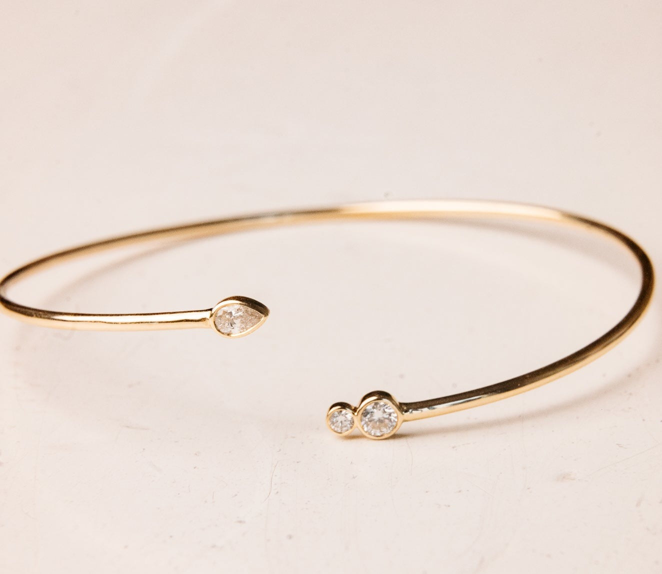 Our Scintilla Celestine Cuff is handcrafted in 18k yellow gold features two round brilliant-cut diamonds and a pear brilliant-cut diamond.