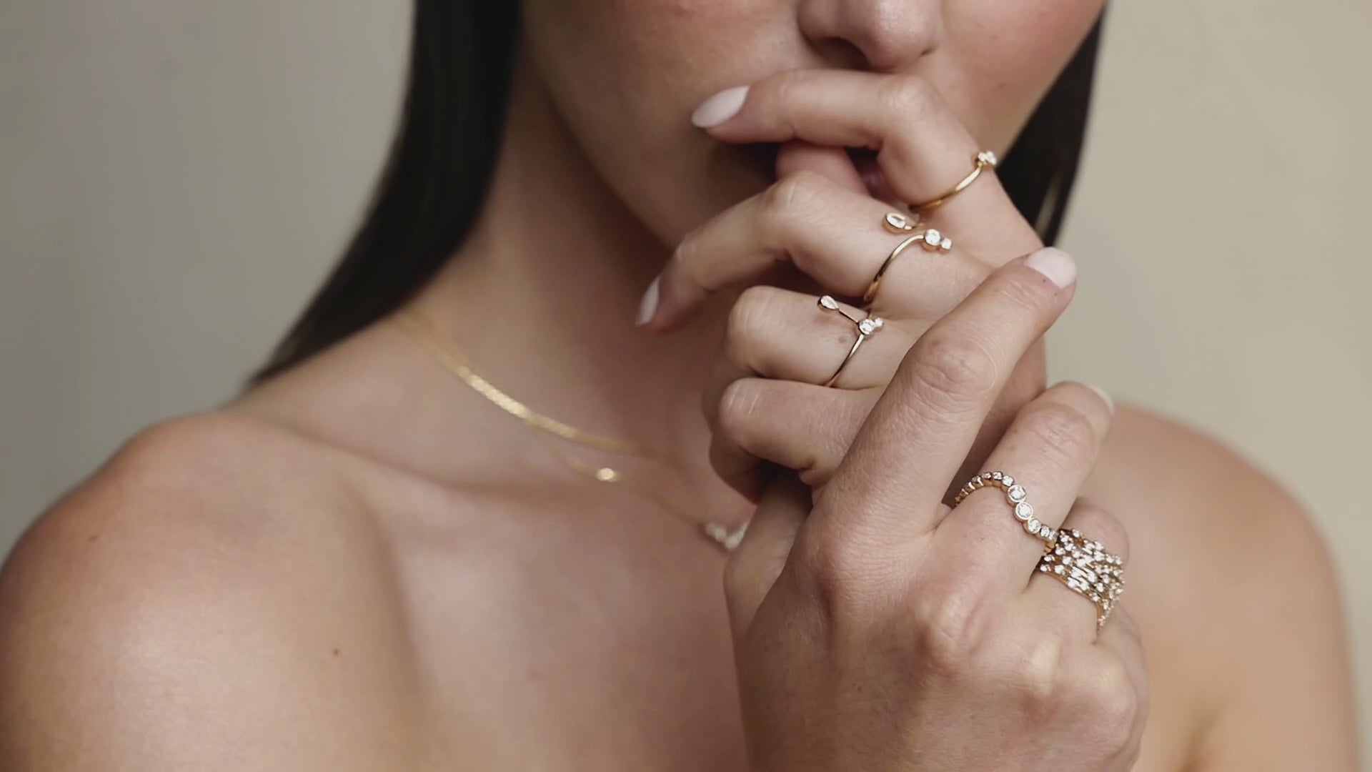 Our Scintilla Ring can be worn two ways and is handcrafted in 18k yellow gold and dotted with two round brilliant cut-diamonds and one pear brilliant-cut diamond.