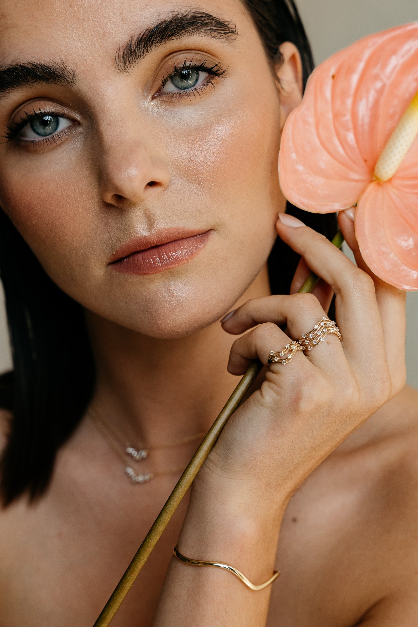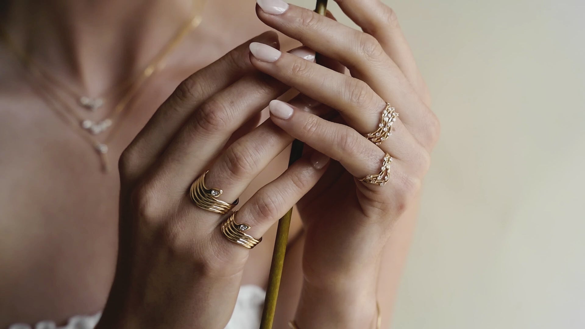 Layered wave ring handcrafted in 18k yellow gold, speckled with 23 floating VS diamonds weighing at 0.39ct.